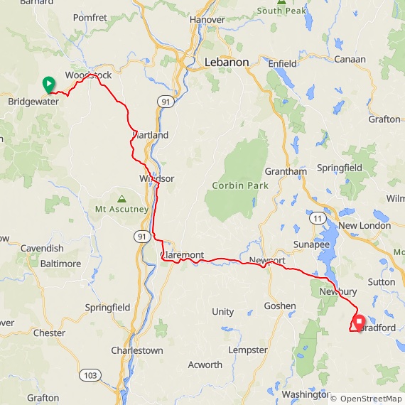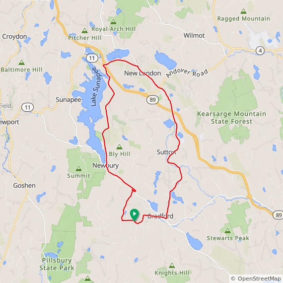 Circular ride from Bradford. Through old villages and a museum at South Sutton to New London, home of a college campus and another museum. We return passing a trio of lakes.