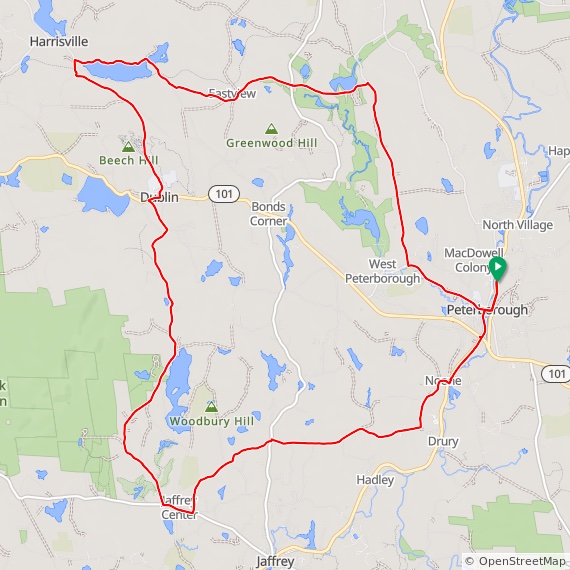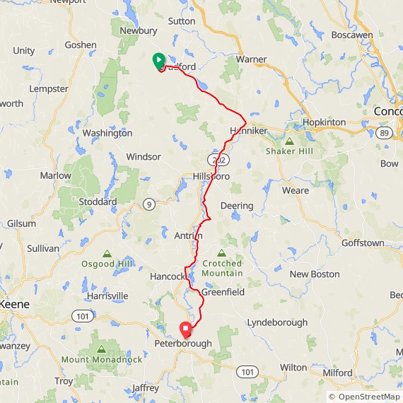 Bradford to Peterborough. Through Henniker, a milltown turned college community before heading south to Peterborough, utilising a section of rail to trail.