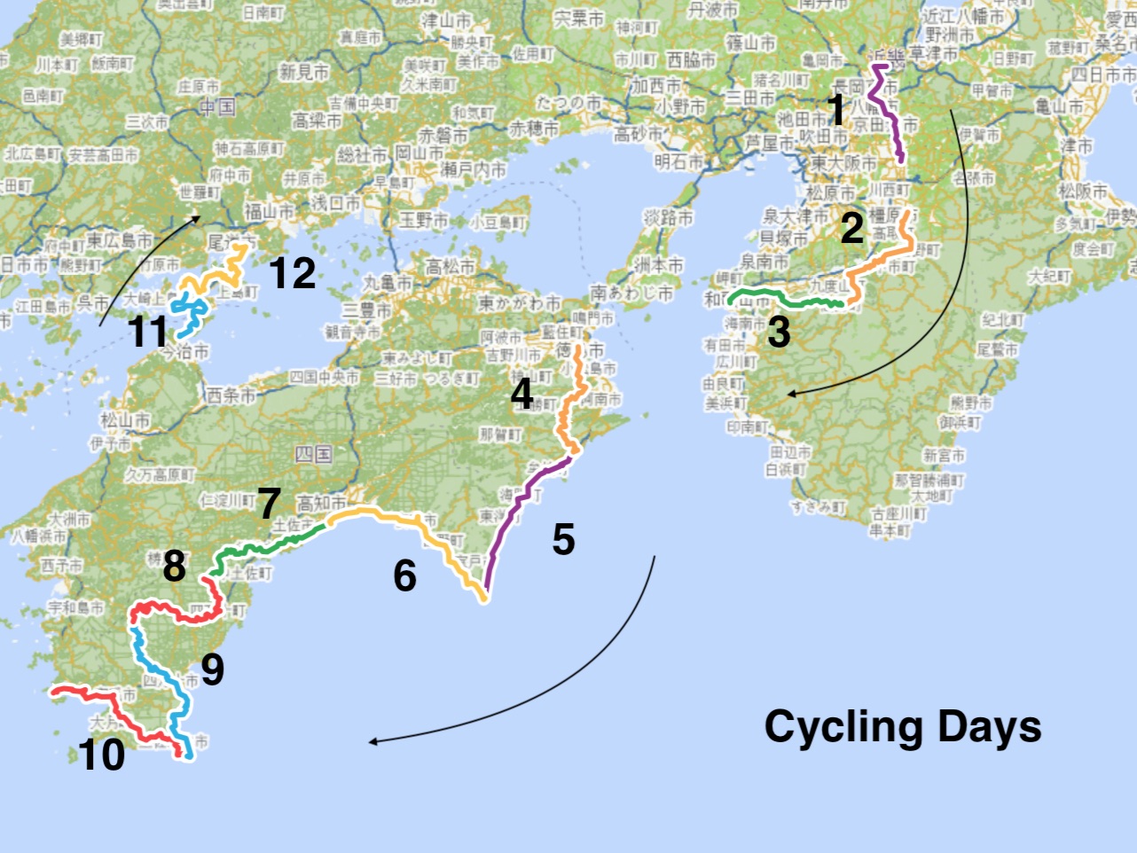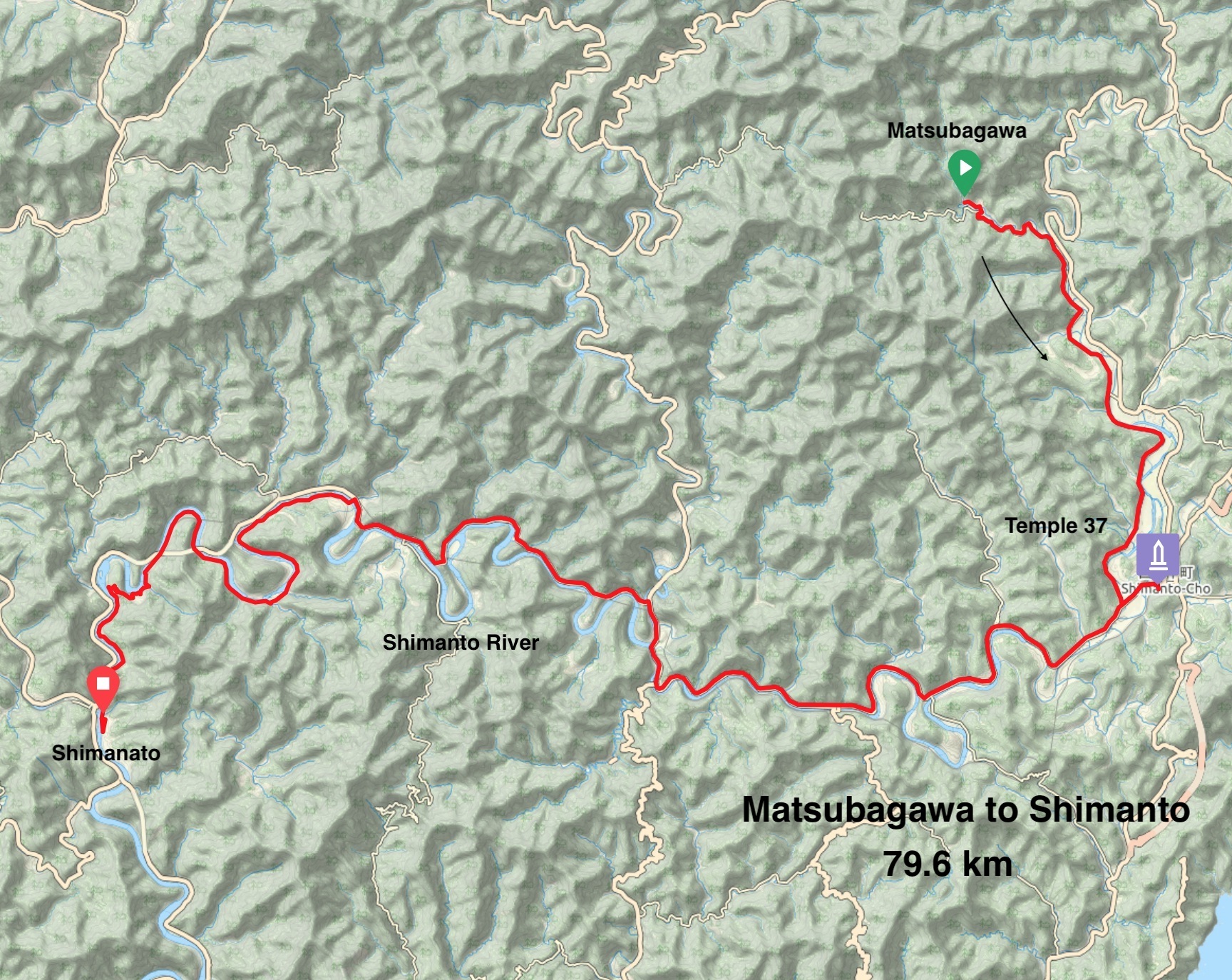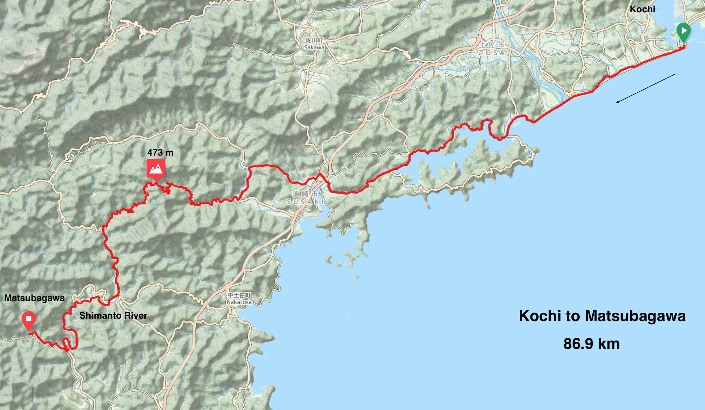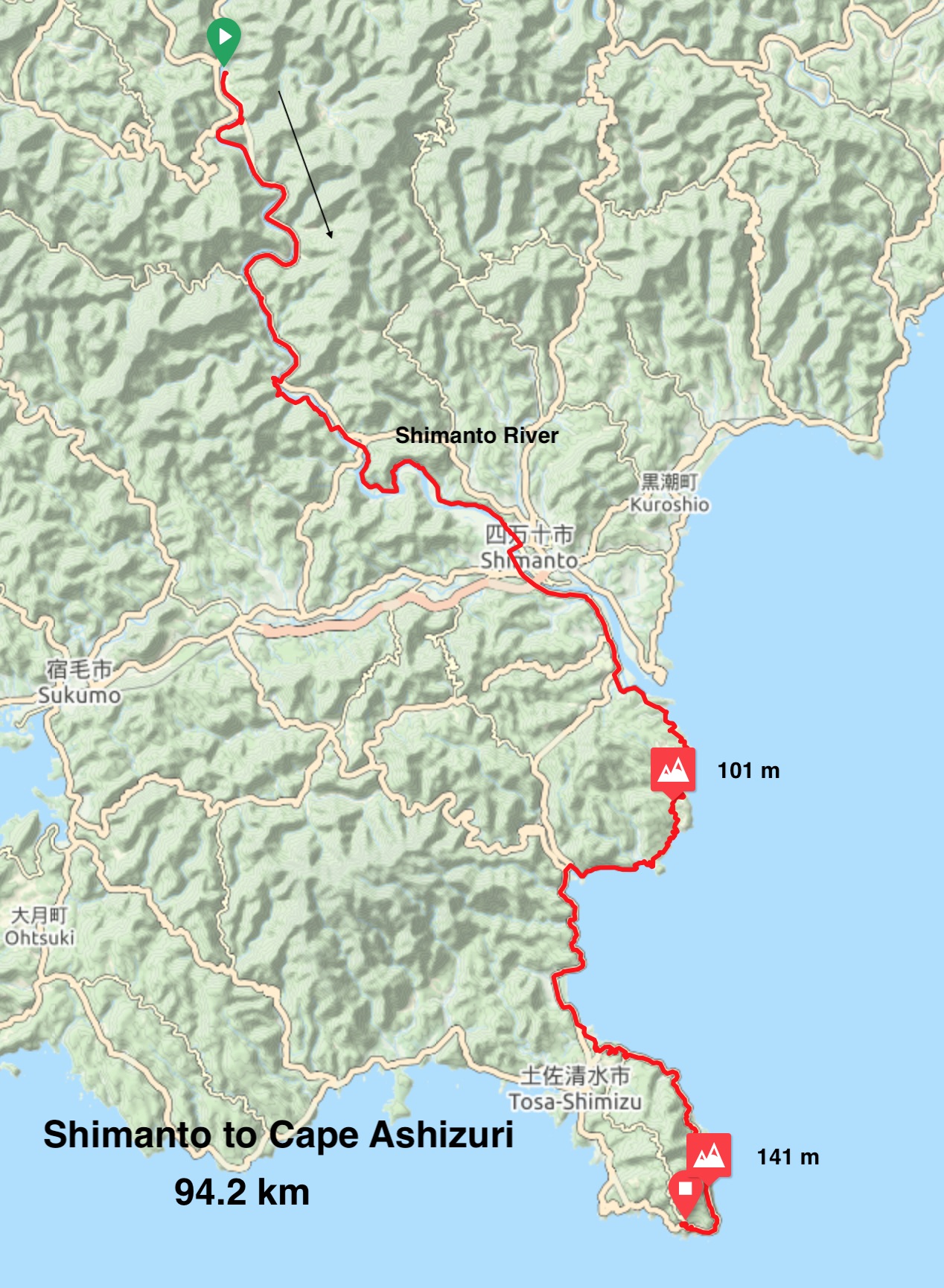 We start the day with the sounds of the Pacific Ocean to our left as we cycle along the coast to Usacho. More water after that as we head along the northern shore of a huge inlet, after which we head to Susaki which will be the largest town today. There are a few tunnels on this section that create a few spikes on the elevation, the longest being 800 metres long. They are lit and there is a pavement running through the longer one. After Susaki we follow the Shinjo River before starting the climb of the day of 453metres. We then descend to follow the Kudaru River and then the Shimanto River before a gradual climb of 4km to our accommodation at an Onsen Resort.