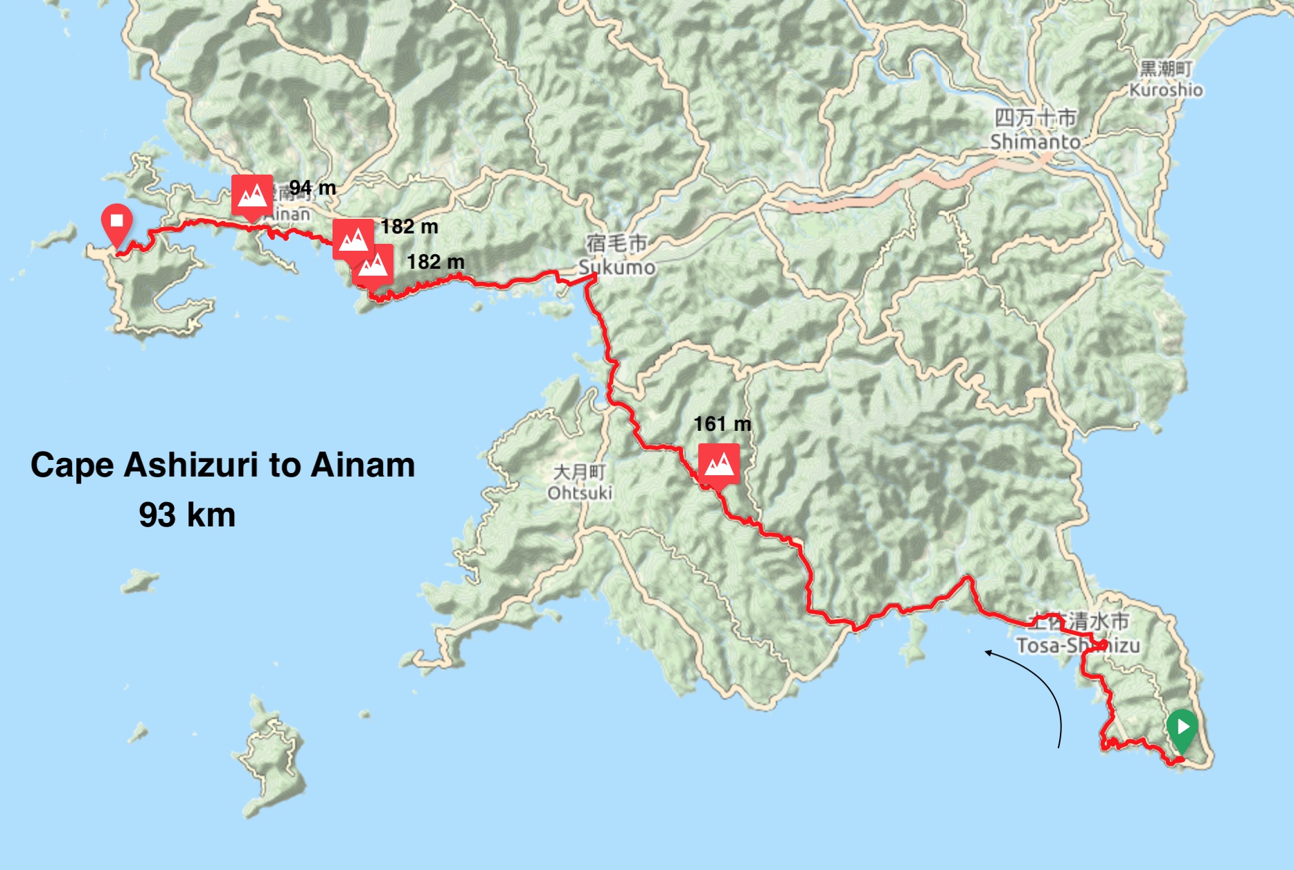 From the cape, we continue our journey through the Ashizuri Uwajima National Park and head inland for a change on a delightful countryside road. Having passed through Sukoma, we pass the John Mung Museum. Over a climb to descend to the Pacific again and ride along a quiet road above the Ocean culminating in a couple of climbs. Finishing in Ainan, stroll the streets and sample the locally caught bonito fished locally.