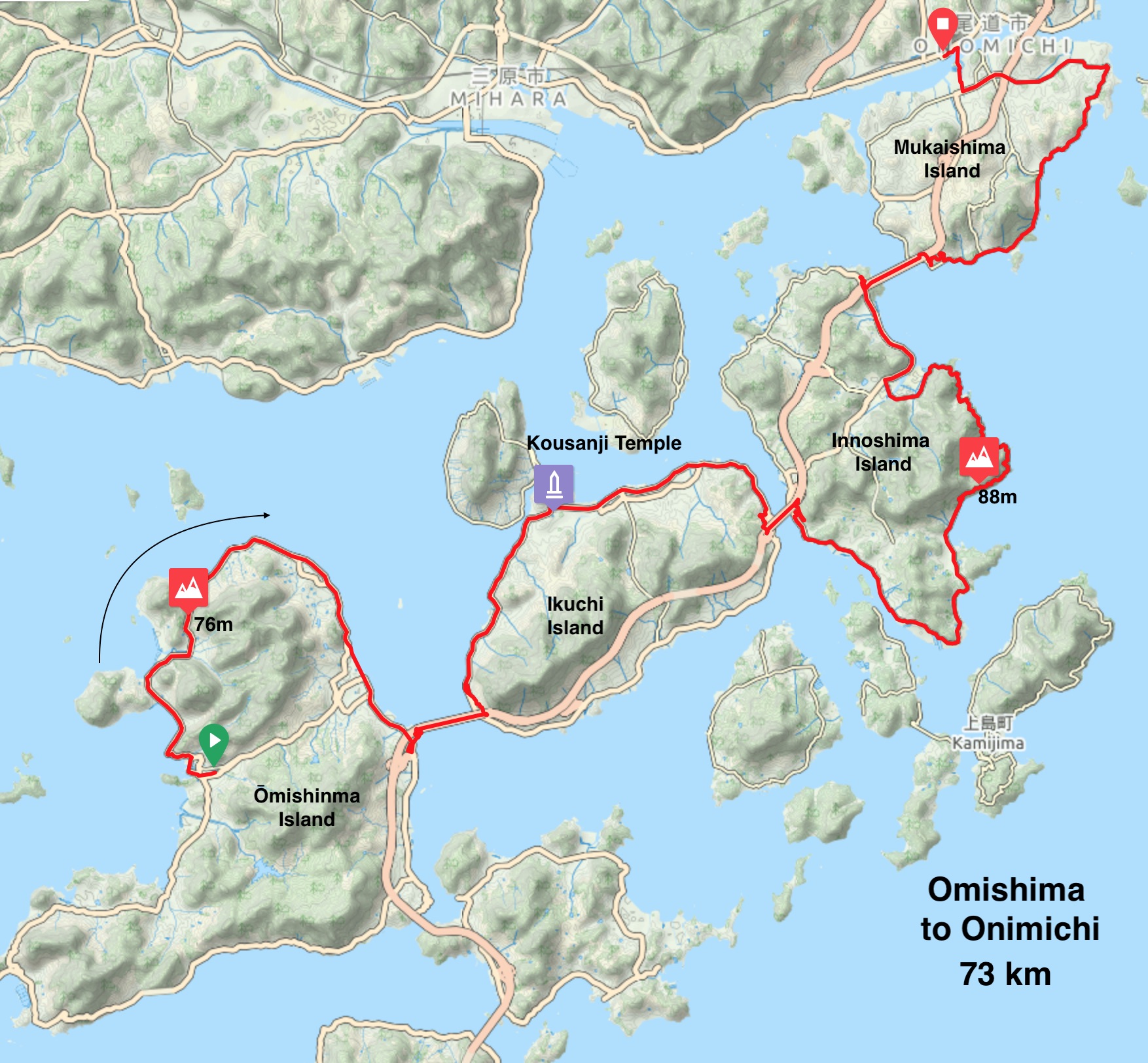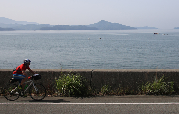 We rest our legs this morning while travelling to Imabari by van, and have lunch at a seaside restaurant with stunning views of the Seto Inland Sea. The road connecting Imabari and Onomichi in the mainland Honshu is known as Shimanami-Kaido (highway above the sea). The designated cycling paths and bridges have made the area a cycling Mecca of Japan, attracting a number of cycle tourists from other regions of Japan. Today we cycle across two islands and end up in the third island Omishima in the heart of Seto Inland Sea.