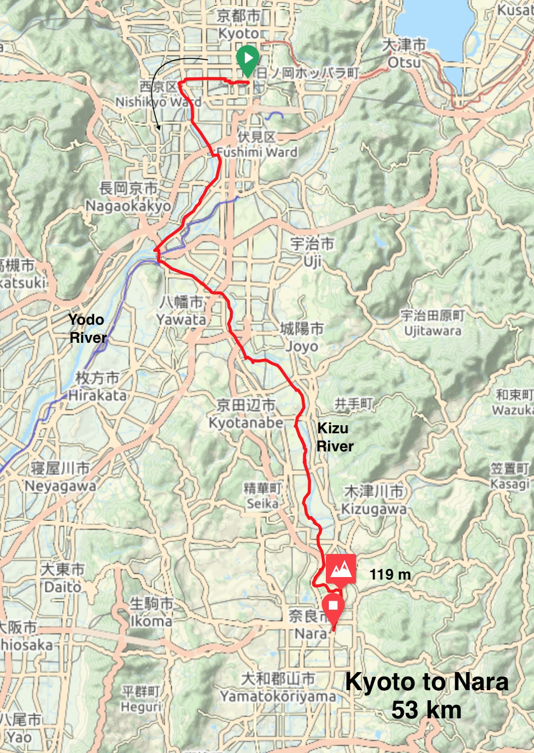 Our first riding day is a gentle introduction to cycling in Japan. Starting from the centre of Kyoto we head west past the aquarium arriving at the Katsura River. Heading south we follow the east bank along cyclepaths for 18km until we cross the Kizu River and follow it for another 15km sticking mostly to cyclepaths. Having entered Nara the one climb of the day at 70 metres takes us to our overnight stop in a hotel near the station.
