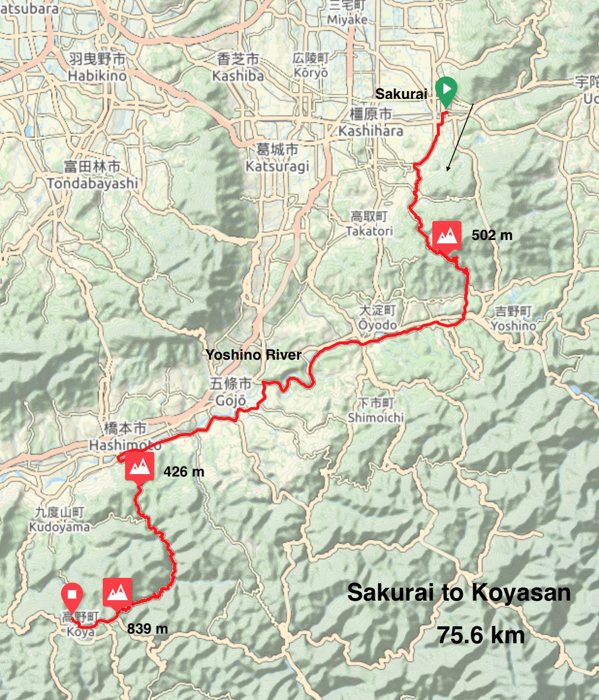 Starting from Sakurai station we head south out of Sakurai heading for the first climb of the day at 502metres. Descending to Yoshino, we cross the Yoshino River, which we will follow for the next 30km passing Shrines and parks. The final part of the day takes us over 2 summits as we climb our way to the finish at Koyasan
