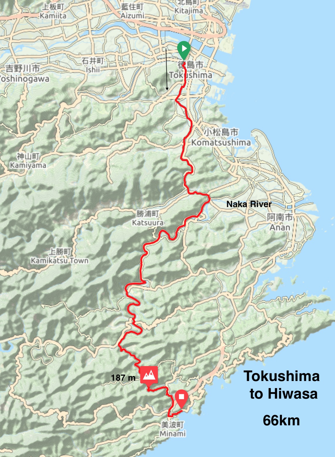 Starting from Tokushima, we head south through the city in the shadow of Mount Bizan around which the city is built. Much of the day is spent following two river valleys . The first , the Katsura River takes us through Jorokucho before heading for the countryside. We pass over a small rise to the Naka River which we follow upstream as we wind our way towards the Pacific Ocean. A final climb to a 190 metre summit, then a fast descent leads to Hiwasa on the coast where we will spend two nights.