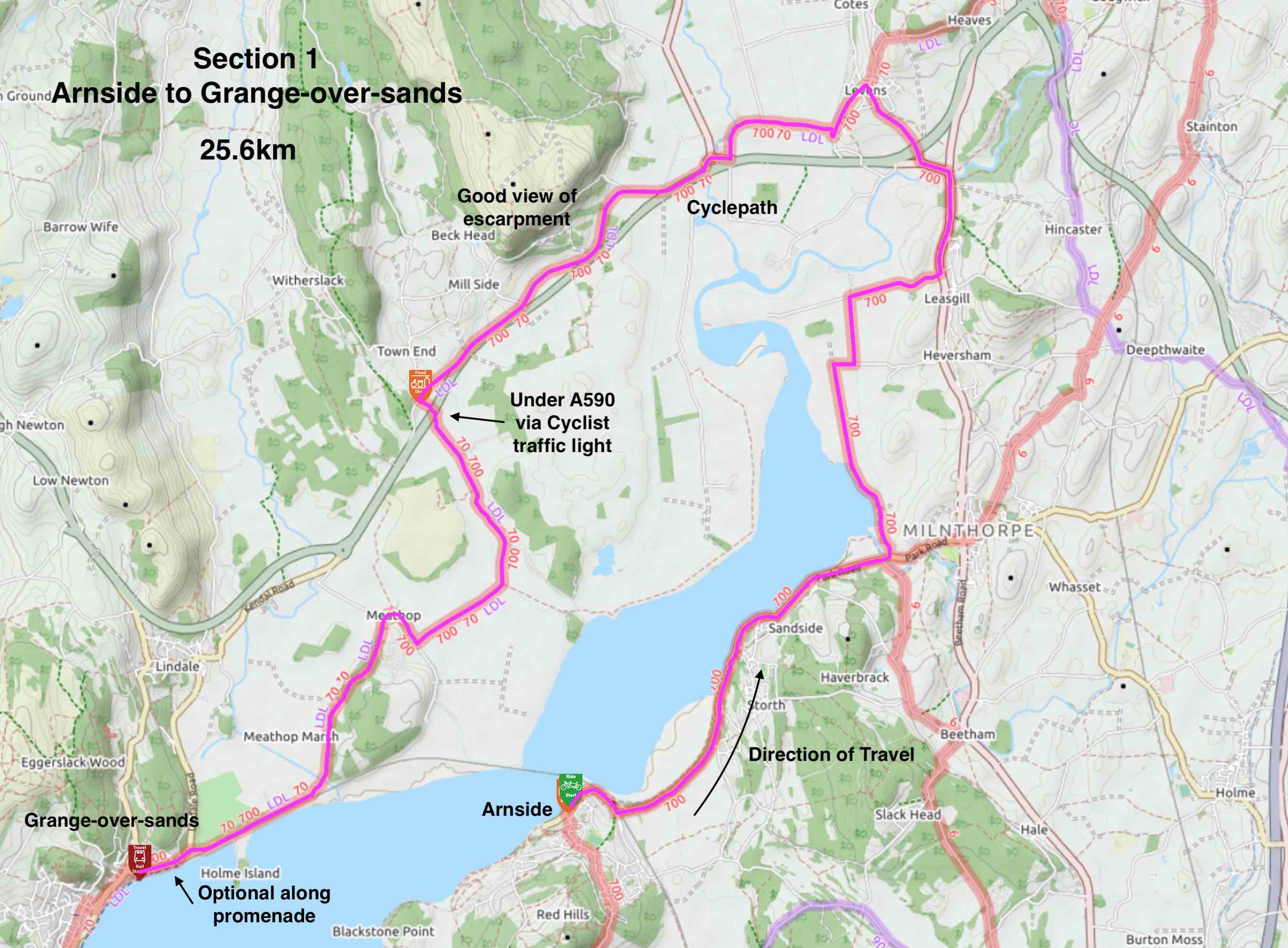 This section starts at Arnside Pier. It sounds grand but it's smaller than expected being a 20 metre stone structure that juts into the estuary. From the pier the ride sweeps the bay heading briefly inland before extensive views to the left of Morecambe Bay and the fells. Swinging north and inland, you pass through pretty agricultural land, which is very flat with only 2 small climbs. The lanes are narrowish and full of cyclists. It gets a little busier around Levens Hall where you join the A6, however most traffic is on the A590 and there is a stretch of pavement to use. Through Levens and some cycling infrastructure kicks in. There is a cyclepath and bridge built for cyclists that parallels the A590 and a route under the A590 that is controlled by a traffic light specifically for cyclists. After this you have one more climb before arriving on the outskirts of Grange. The Cumbrian Cycleway and the newer Sustrans routes (70 and 700) enter Grange along the road. However it is highly recommended to enter via the promenade but you need to walk your bike for a section