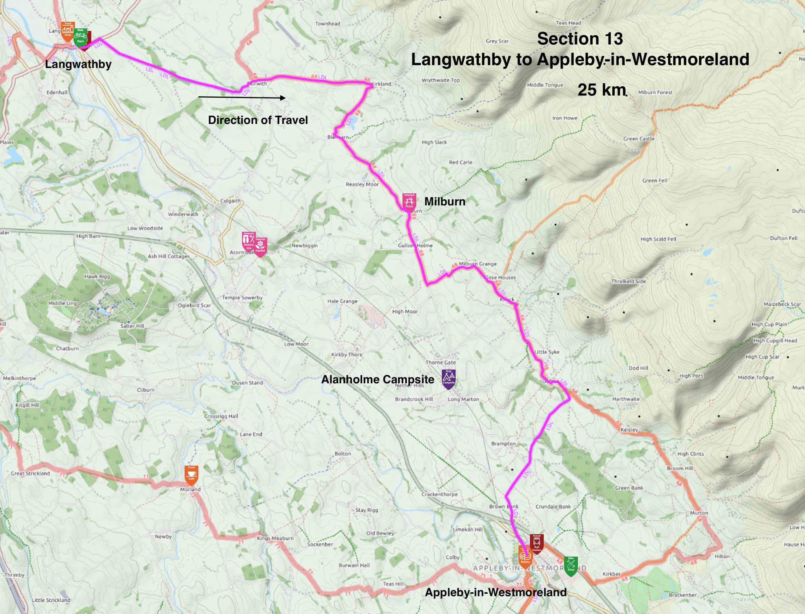 The ride starts from railway to the north of the centre of Appleby-in-Westmorland. You descend towards the town to bear right into the centre. It's an attractive place with many older buildings worth a look. You cycle up Boroughgate, a wide main street. It is marked by two pillars at the top and the bottom. The one at the bottom is an 18th century copy of the 17th century one at the top where you will bear right to leave town.Heading out you will gradually climb admiring the wonderful views to the left on a road that more resembles a whole series of roller coasters. The hills to your left are the Peninnes and as with much of the Eden Valley this is an agricultural area for both sheep and dairy cattle.Descending through Soulby you'll climb towards Kirkby Stephen and when you arrive, you'll head right along its attractive High Street to finish at the Tourist Information on the left hand side.