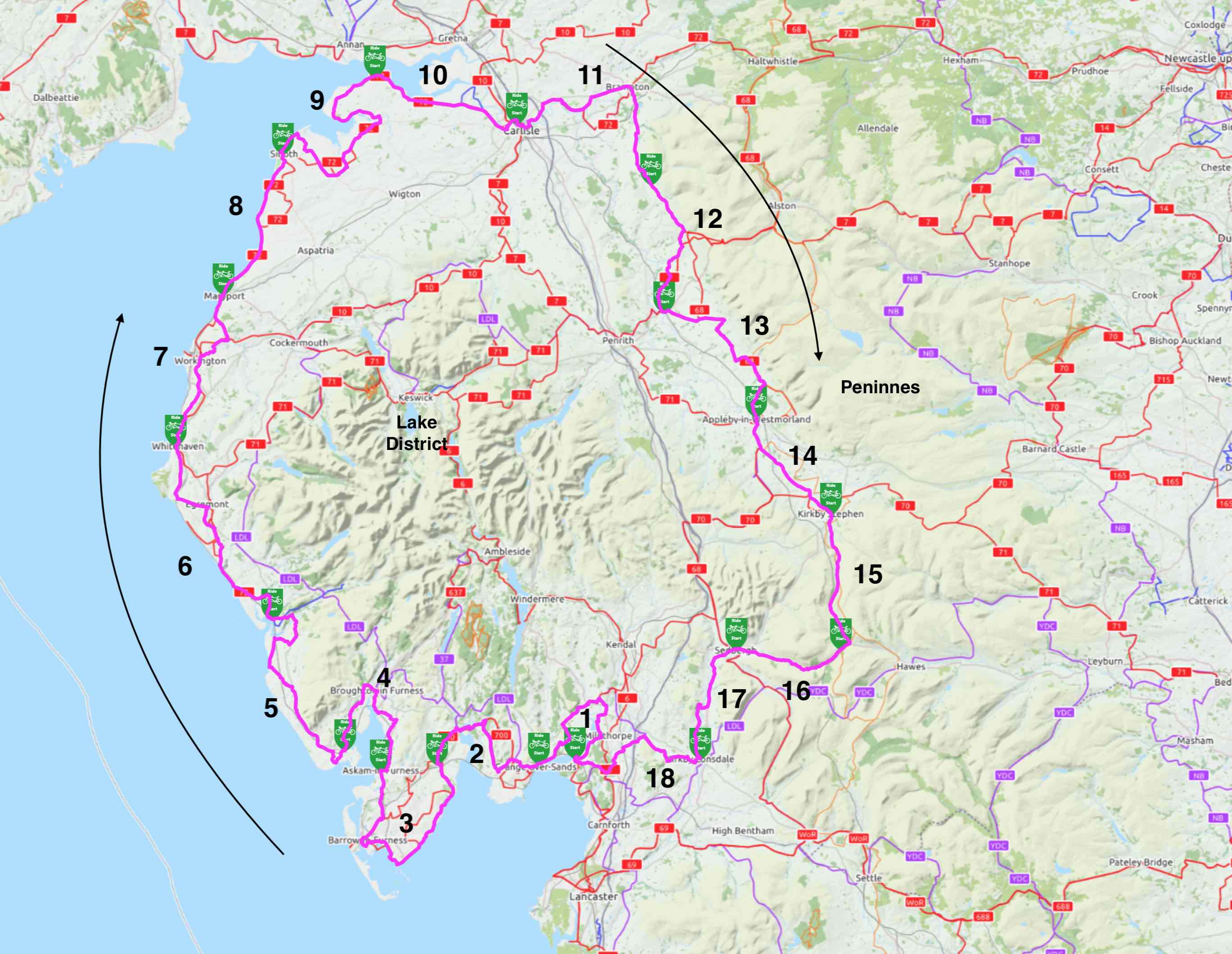 There are a few big roads around Kirkby Stephen but this route has a cunning way out.Heading out from the centre you cross the A65 by a dedicated cyclepath. It’s not particularly easy as there is a lot of traffic on this road, but the infrastructure remains.There follows quite a climb through narrow lanes and seemingly endless sheep to the appropriately named Hutton Roof. The route then drops to cross the M6 and then the A6, as well as a canal.You will hit flatter lanes near Arnside and then something most peculiar, new signs for the Cumbria Cycleway appear. My suspicion is that you are now in Lancashire and the neighbouring county are still under the impression that it still exists much like the Lancashire Cycleway.On the edge of Arnside you turn into the town for a climb up Briary Bank and then descend back to the shore and the end of this section.