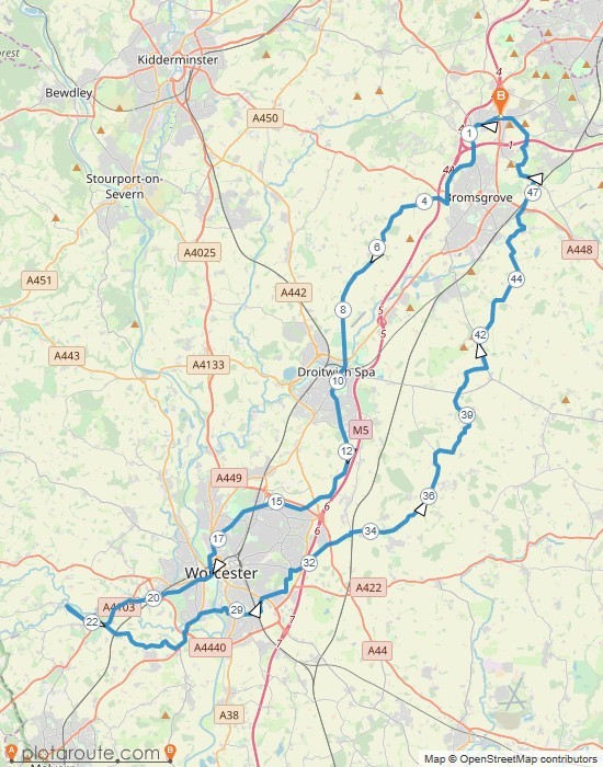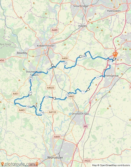 A loop to the south west of Bromsgrove to just beyond Worcester