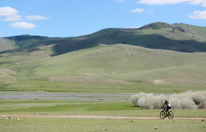 Arrive in Erdenet, sitting on one of Asia’s largest copper deposits, just in time for breakfast and meet your support team. Having made the last adjustments to bikes, we start our biking adventure by riding through the suburbs and a few crop fields on the outskirts of the town. Out into the wild for a leisurely pedal across wooded hills and a wide-open valley dotted by nomadic tents and massive herds of livestock. It is an easy day with plentiful stops for familiarizing yourself with your new environment and cycling routine. By early evening, we arrive at our first campsite on a small hill overlooking the open valley with some time left for exploring neighboring ridges. On most of the nights on this trip, you will sleep in a comfortable commumal tent camp erected every afternoon upon finishing the day’s biking. It provides all the amenities of a good wilderness camp, including tents designated for dining, showering, and bathrooms, not to mention great meals cooked by a chef.