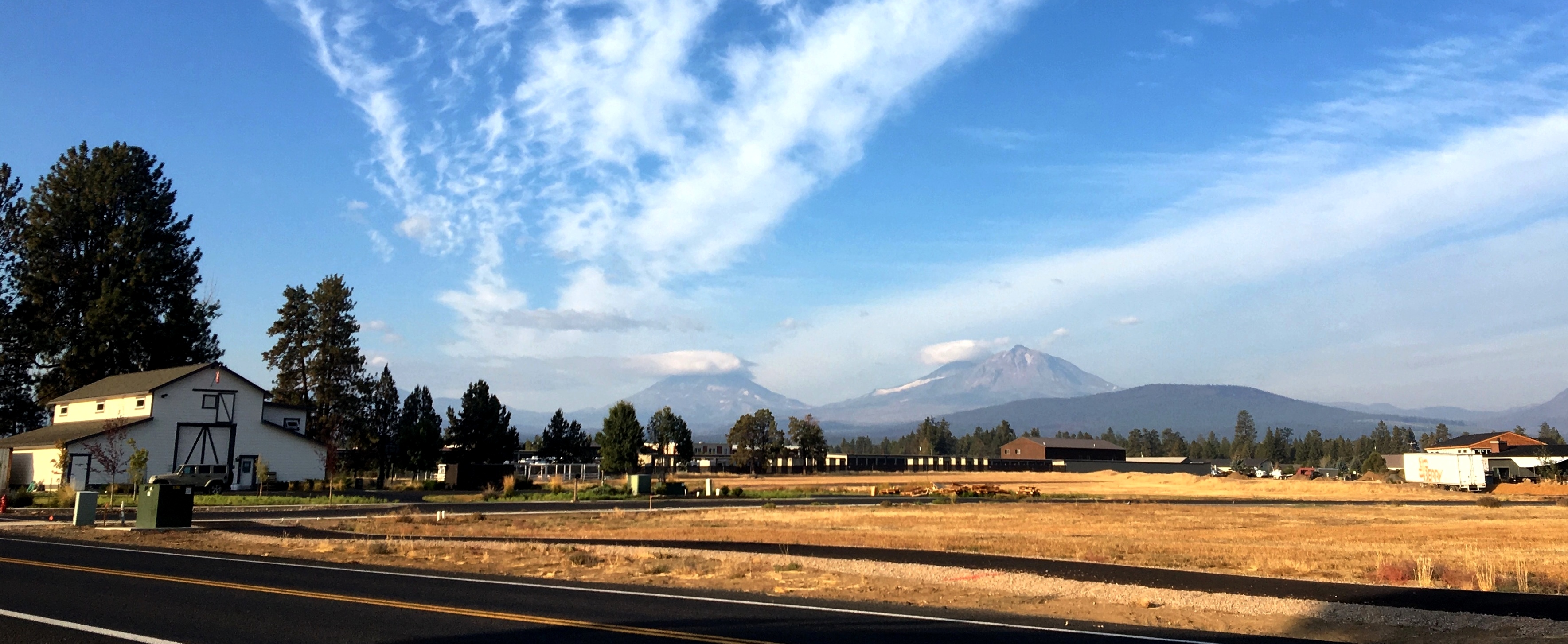 The exquisite Sisters Mountains in the background covered in a halo of cloud. A small tourist/artist town in Deschutes County below the Cascade Ranges.