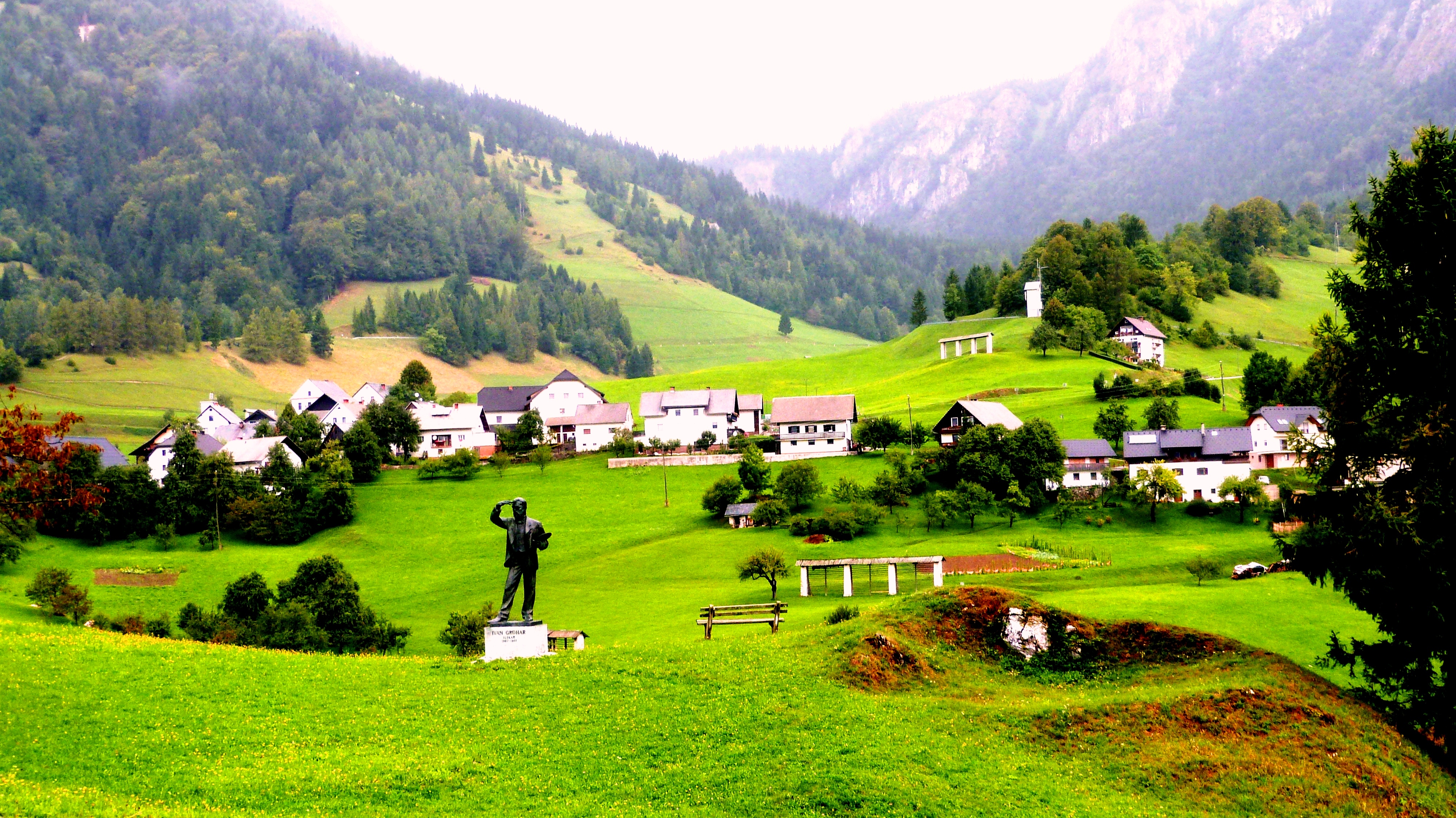 The village of Spodnja Sorica in the Upper Carniola region of Slovenia with the statue of the impressionist painter Ivan Grohar in the foreground, 30km north west of the capital Ljubljana.