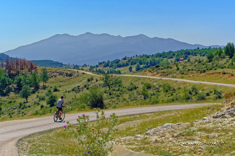 This route starts where the Central Rodopi Mountain tour finishes and was run for the first time in 2019. The first week continues in the Rodopi Mountains after which the landscape suddenly opens out, the mountains are higher with rocky peaks and wider valleys, the forest cover diminishes and the landscape is more arid. Even the local culture changes in this 'Macedonian' part of Bulgaria. Many different mountain ranges in Greece, North Macedonia and Bulgaria can be seen from the route. Of particular note are the Pirin, Bulgaria’s second highest range (Vihren, 2914m). We cycle alongside this range and then over the only road pass to cross the Pirin mountains. Pictures from the route