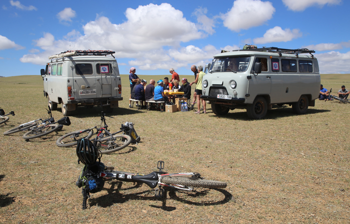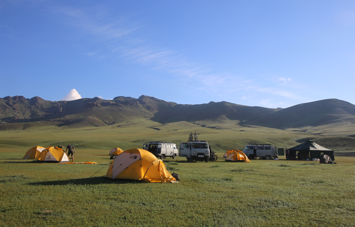 Arrive in Erdenet, sitting on one of Asia’s largest copper deposits, just in time for breakfast and meet your support team. Having made the last adjustments to bikes, we start our biking adventure by riding through the suburbs and a few crop fields on the outskirts of the town. Out into the wild for a leisurely pedal across wooded hills and a wide-open valley dotted by nomadic tents and massive herds of livestock. It is an easy day with plentiful stops for familiarizing yourself with your new environment and cycling routine. By early evening, we arrive at our first campsite on a small hill overlooking the open valley with some time left for exploring neighboring ridges. On most of the nights on this trip, you will sleep in a comfortable commumal tent camp erected every afternoon upon finishing the day’s biking. It provides all the amenities of a good wilderness camp, including tents designated for dining, showering, and bathrooms, not to mention great meals cooked by a chef.