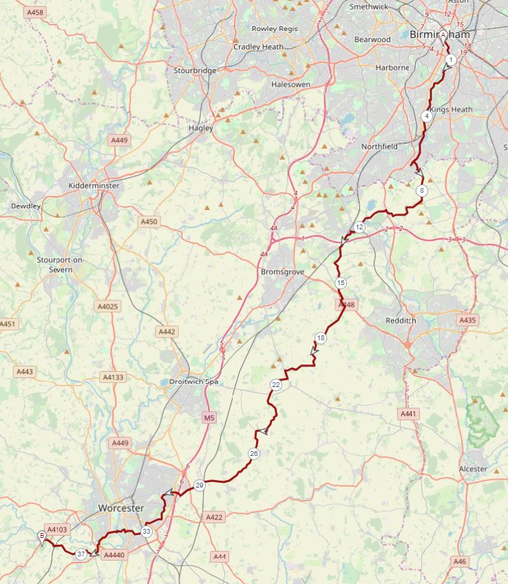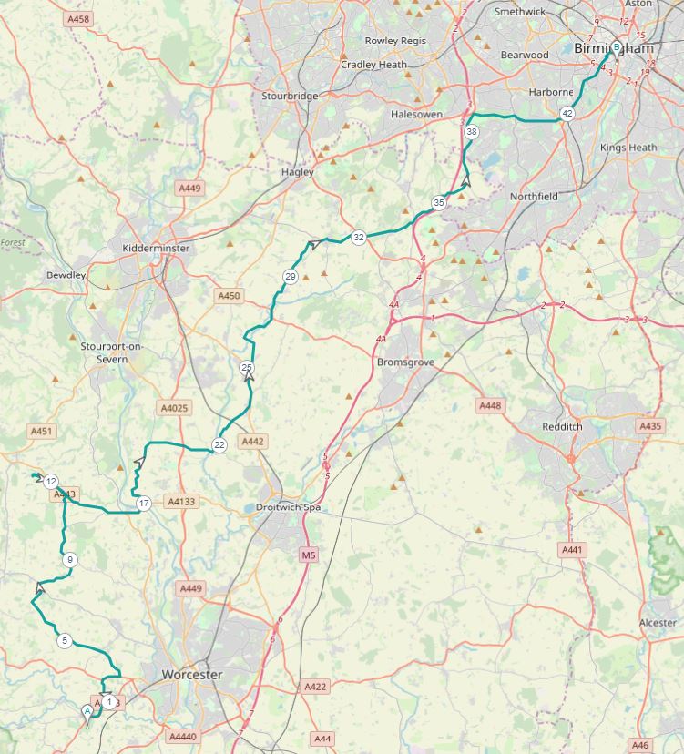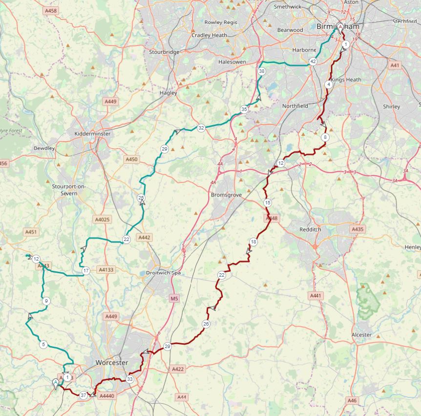 Meet at New Street Station by 09:20am to leave at 09:30am. We head south along the Rae Valley cycle route, picking up the well-paved Birmingham-Worcester canal to take us to the fringe of the city, then country roads to Barnt Green for a café stop. Over the tail end of the Lickey Hills, we bypass Bromsgrove to take lunch at the Jinney Ring craft centre. In the afternoon, we push on to Worcester and the option of a coffee break, perhaps at Worcester Woods Country Park cafe, before crossing the Severn at Diglis foot bridge and heading to Bransford via Powick. Jinney Ring: https://www.jinneyring.co.uk/acatalog/Craft-Studios-and-Shops.html
