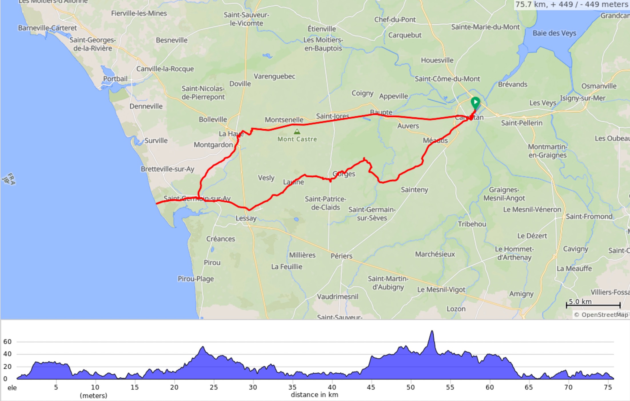 A circular luggage-free ride to St Germain sur Ay on the west coast of the Cotentin peninsular, making a quick stop at the lonely Chapel of St Anne on the marshes. There is a sandy beach at St Germain which faces the Island of Jersey. There are a couple of places to buy lunch. The westward ride is on tarmac country roads and the return is on a cycle path which follows the route of an old railway line.