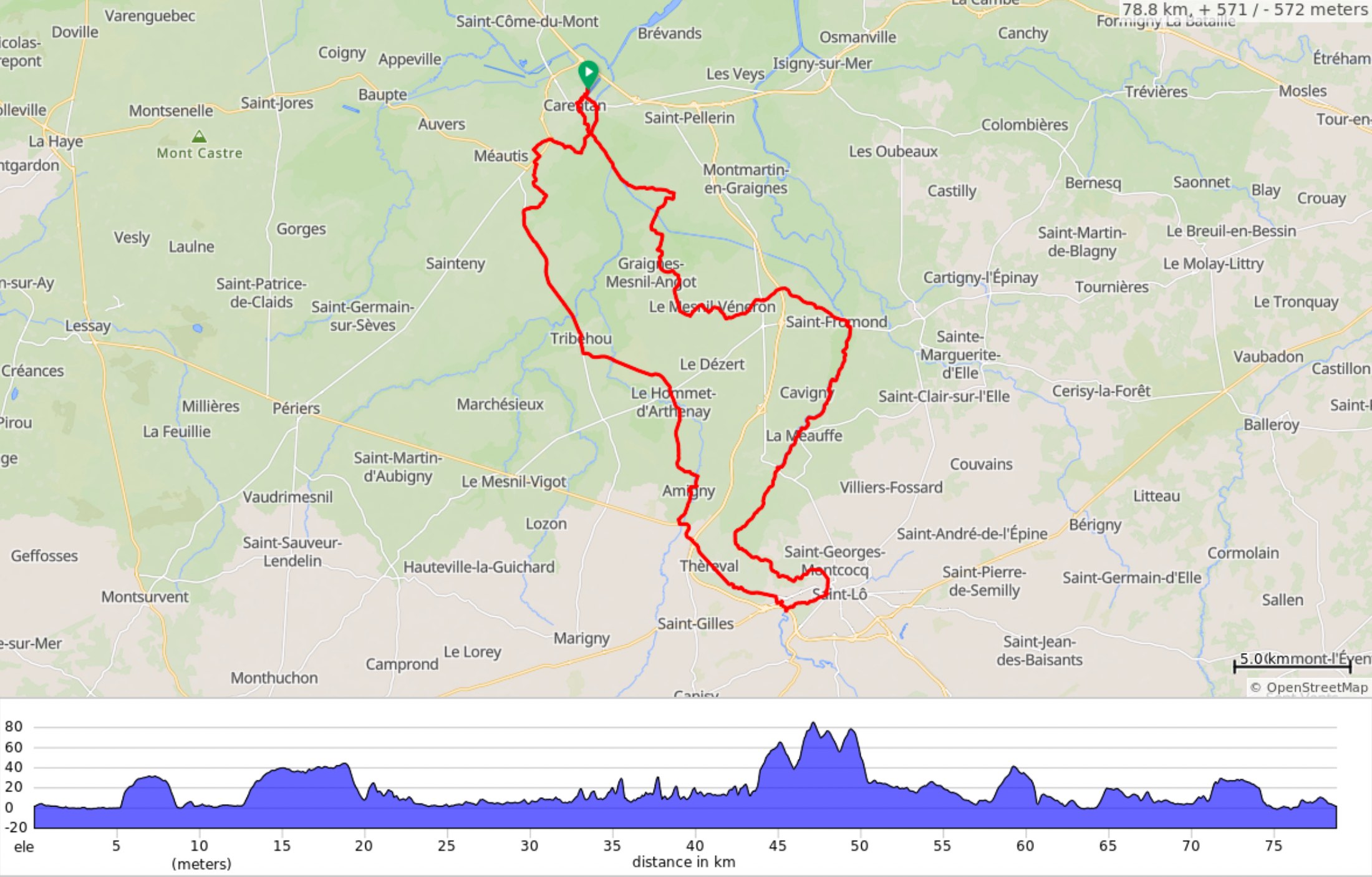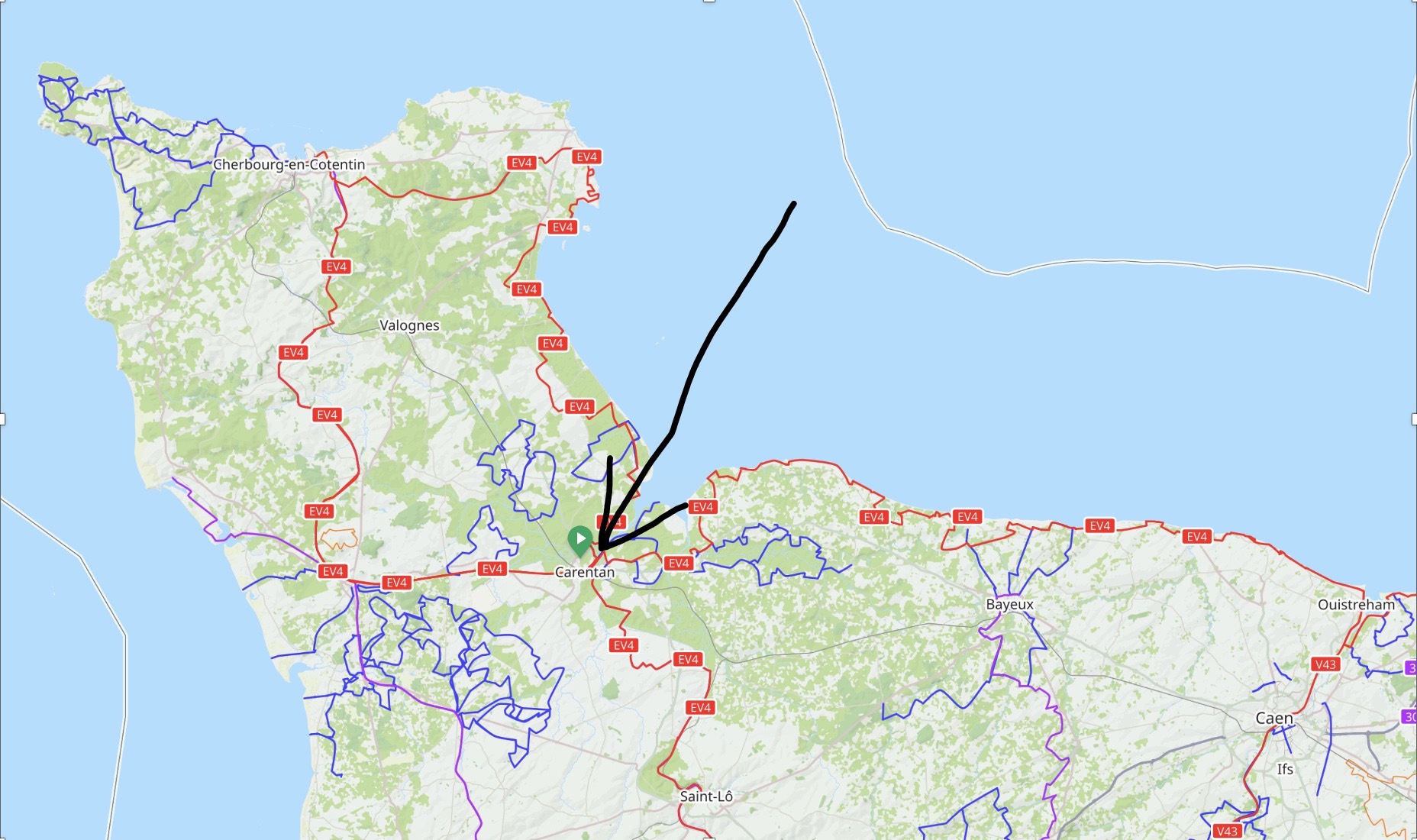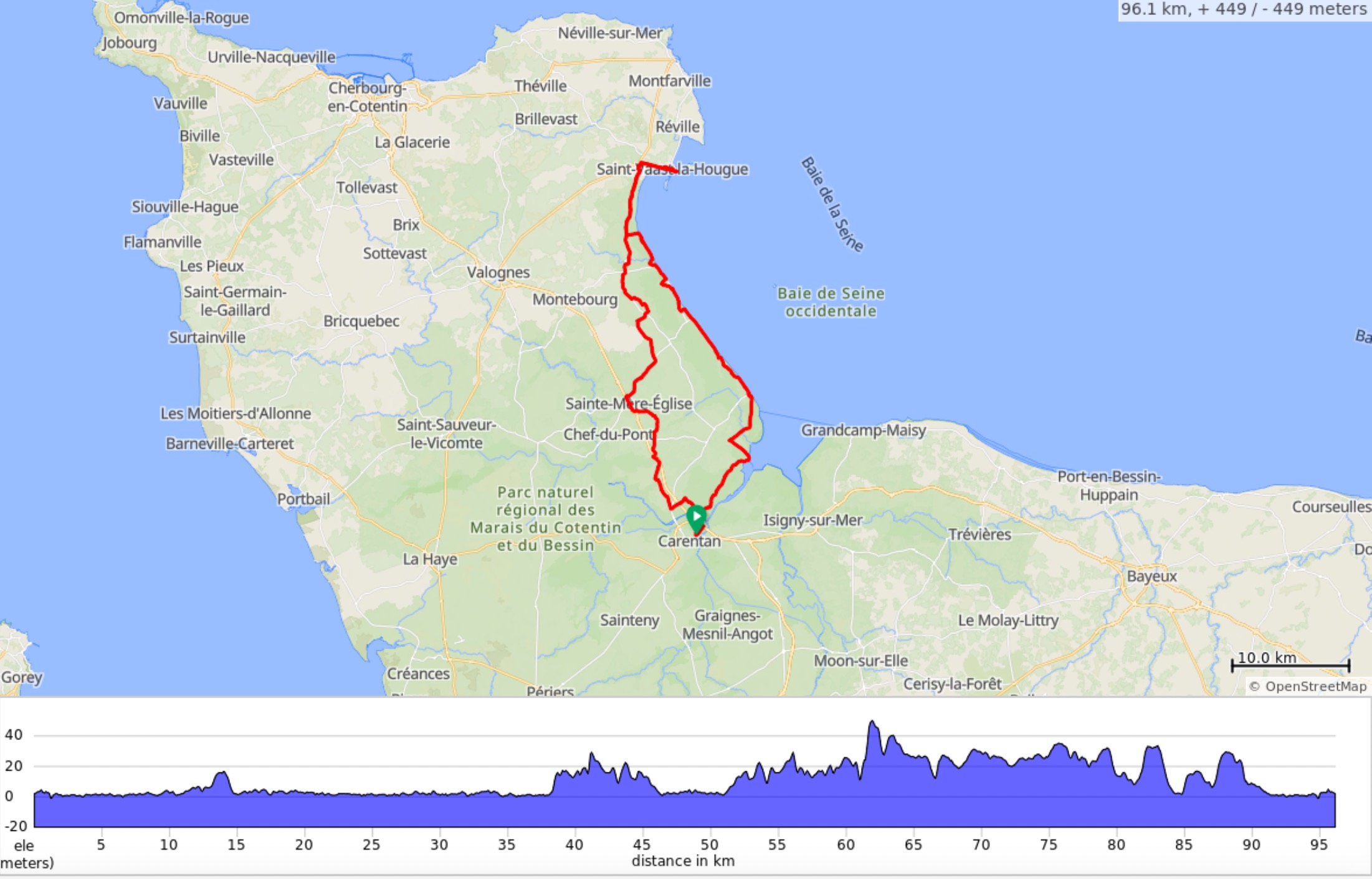The French IGN Top 100 map, No. 106 Caen / Cherbourg-en-Cotentin was used in planning the tour. Pages torn from a cheap road atlas would be perfectly adequate.