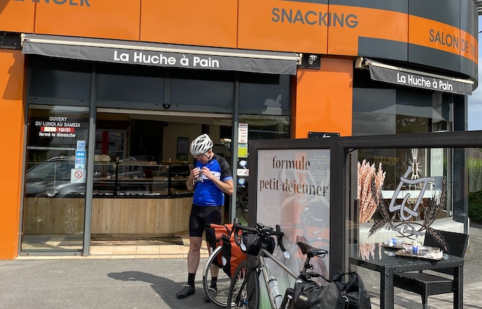 The ferry gets in at 0645. Carrying our own luggage, we ride from Ouistreham (the port for Caen) to Carentan, stopping at a big boulangerie on the outskirts of Bayeux to buy lunch.