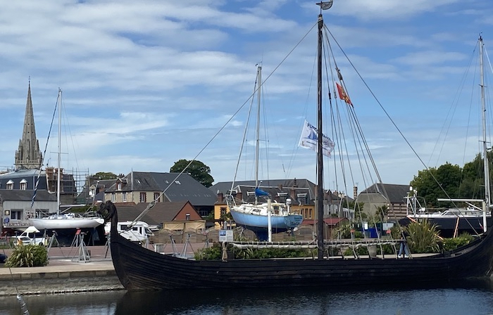 The Tour will be based in the attractive small harbour town of Carentan located at the centre of the Cotentin and Bessin Marshes Regional Natural Park with its areas of hedgerow (called the bocage) wetlands, moorland and coastline. It has a huge variety of flora and fauna. This is great birdwatching country. Last summer, we saw a large flock of white storks circling above us as we rode south towards St Lô. Utah Beach, where American Troops landed from the sea in 1944, is a short ride away from Carentan and so is Ste-Mère-Eglise, where America’s D-Day paratroopers are remembered. The fishing and yachting harbour, St-Vaast-la Hougue, voted France’s favourite village a few years back, is 50km up the coast. The Medieval city of Bayeux lies roughly half way between the port of Ouistreham and Carentan. From a couple of kilometres away the great spires of its cathedral are visible across the surrounding fields and are a useful landmark for cyclists. This city is, of course, the place to see the Bayeux tapestry which, among other things, depicts the Viking style ships which carried William the Conqueror and his army across the channel to England in 1066. A reconstruction of one of these ships can often be seen moored in Carentan harbour.