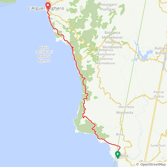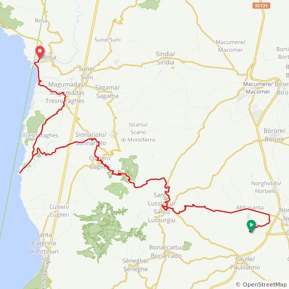 Leave the Hotel along the SP15. After 8.5km we can visit the Chiesa di Sant' Agostino on right. At Cuglieri the Basilica Santa Maria della Neve affords great views from the terrace. Bosa is a delightful town on the coast overlooked by its imposing castle, Castello di Serravalle. It is the home of Malvasia di Bosa, a sweet white wine.