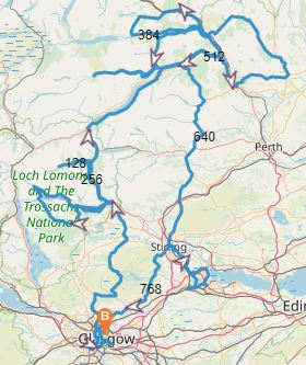 Leaving Glasgow city centre mainly on cycle paths and then minor roads from Milngavie into the countryside. We cross the Campsies via the Crow Road with fantastic views from the top. Then on to Fintry for a coffee, before continuing to Callander.