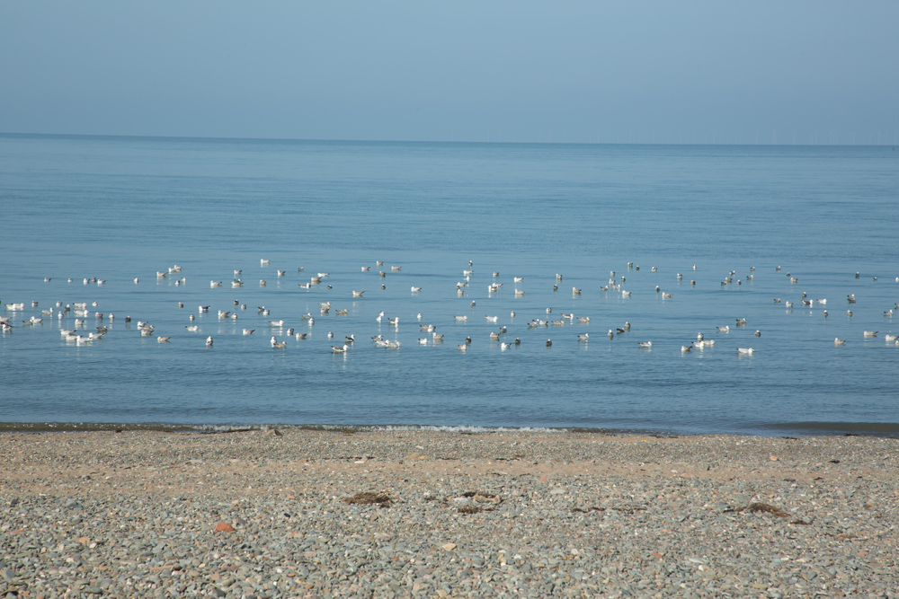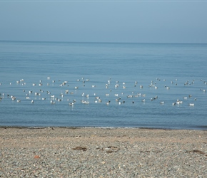 Seagulls bob on the water to enjoy the early morning sun