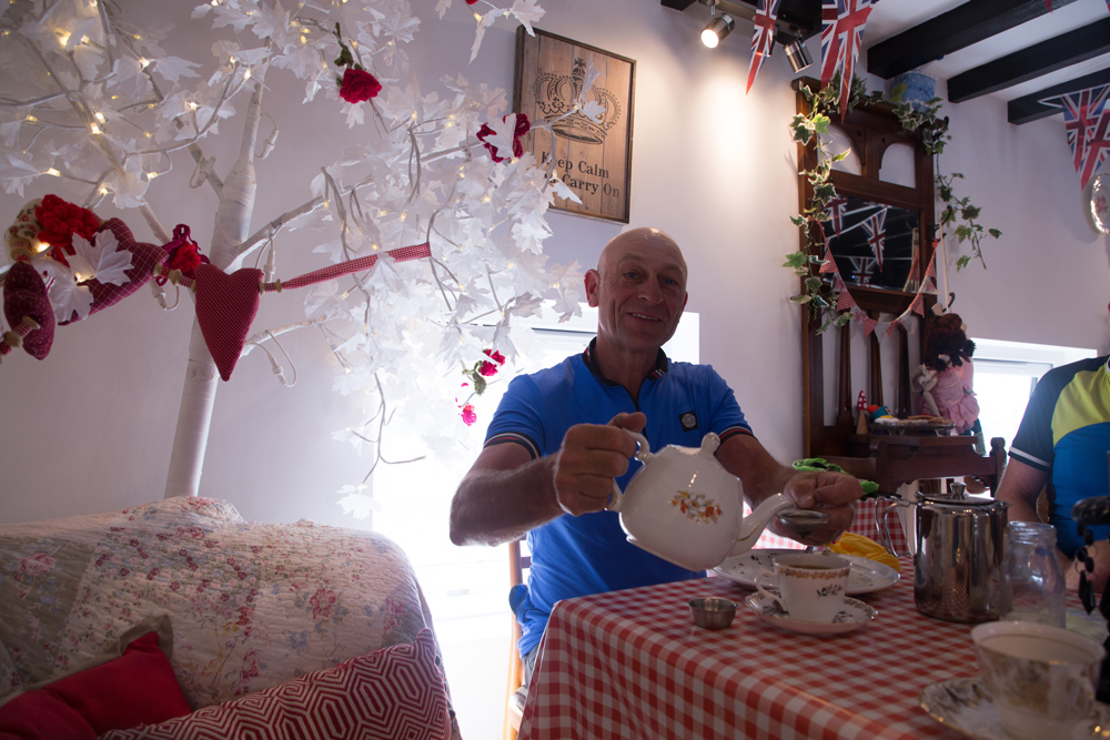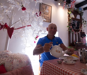 Dave pours a cup of tea at the Fairy Dust Cafe in Silloth