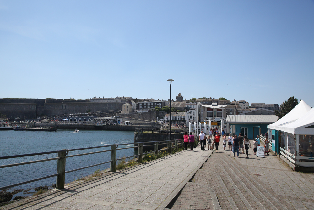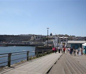 Approaching the Barbican and Mayflower steps. You'll pass the aquarium on the right, a good place to walk