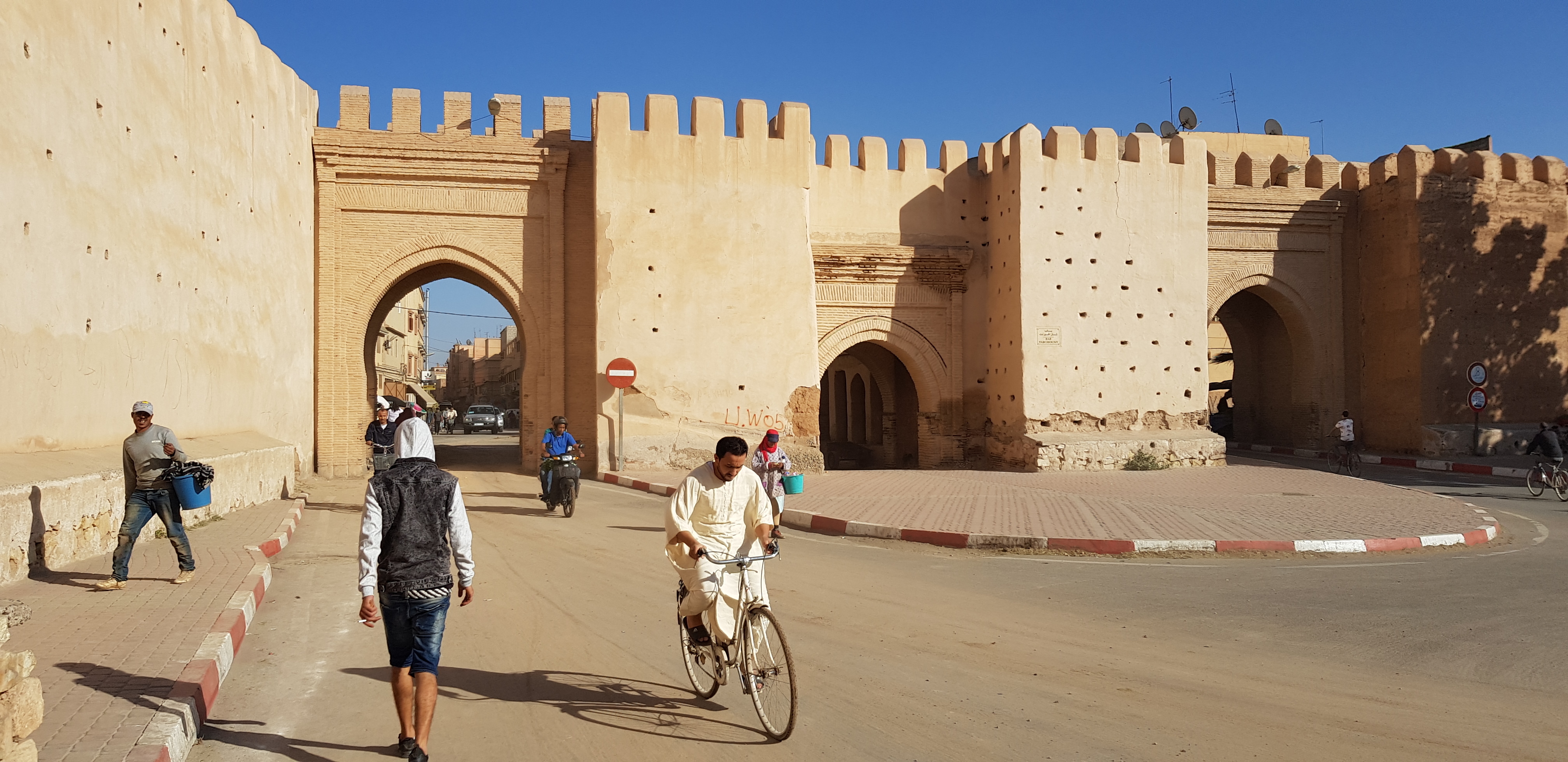 he southern part of Morocco is renowned for its walled cities like Taroudant and Tiznet. The ancient protecting walls built using the traditional building methods of rammed earth, (Pisè de terre) with many gated entrances are gems to explore by bike with narrow passageways giving way to open meeting areas and huge markets. The markets are always full of fresh vegetables, nuts, couscous and every variety of fruit imaginable.