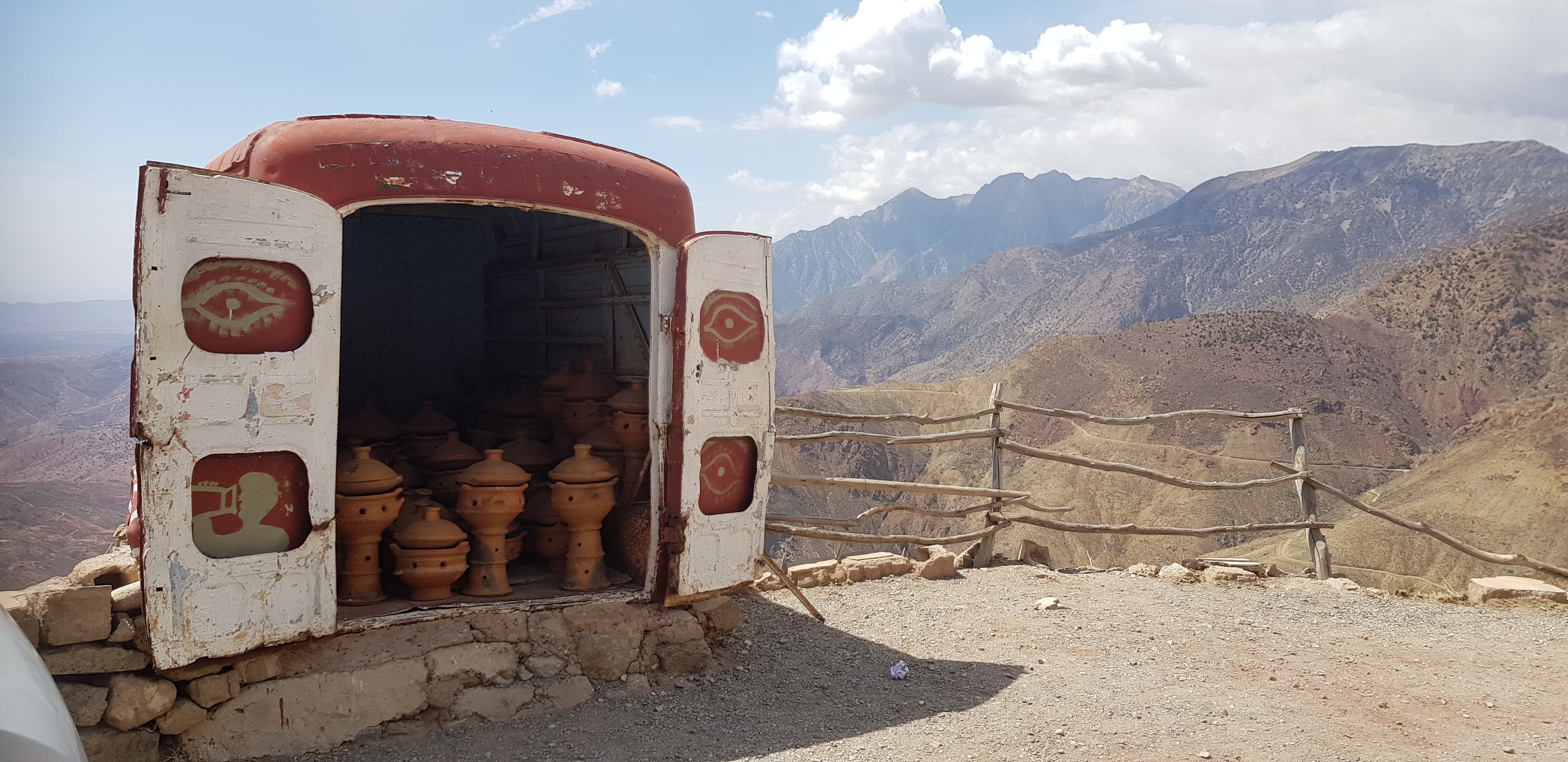 Tagine is the food of choice everywhere. This spicy dish has many variations and is cooked in its iconic conical dish and served with tonnes of bread. For travellers this roadside dish is a life saver after many hours on the road and washed down with pots of that hot green tea.
