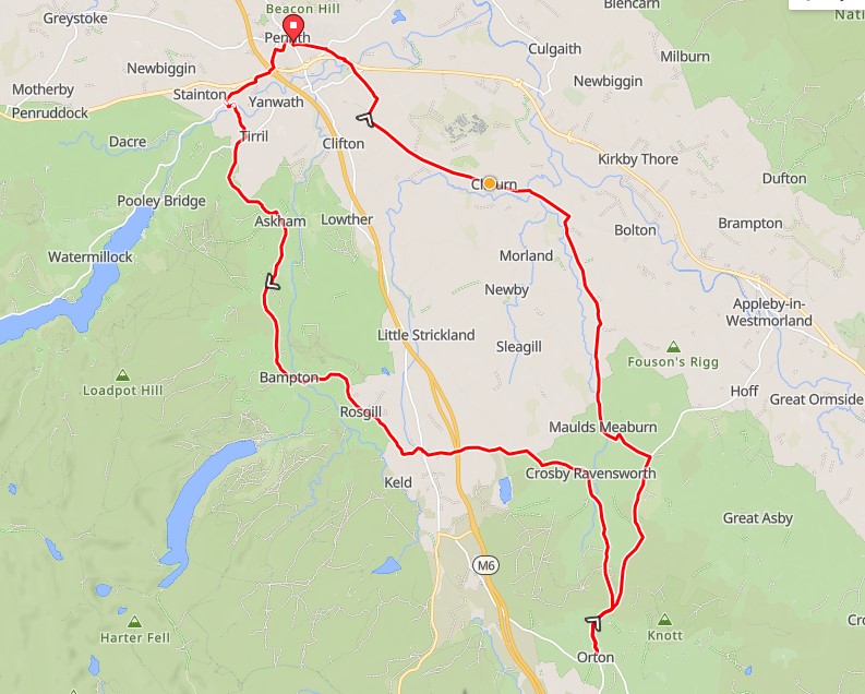 We ride south following the previous days cycle path from Penrith to go through Askham and Bampton Grange crossing the A6 then M6 at Shap. The main road was notorious for being blocked with snow in winter. Shap summit on the A6 is about 411 meters, and is the highest point on the West Coast Main Line. We carry on southwards to our stop at Orton Scar Café after 36km. Retracing our route we head north to Kings Meaburn and a welcome flatter section back to Penrith where the trip ends.