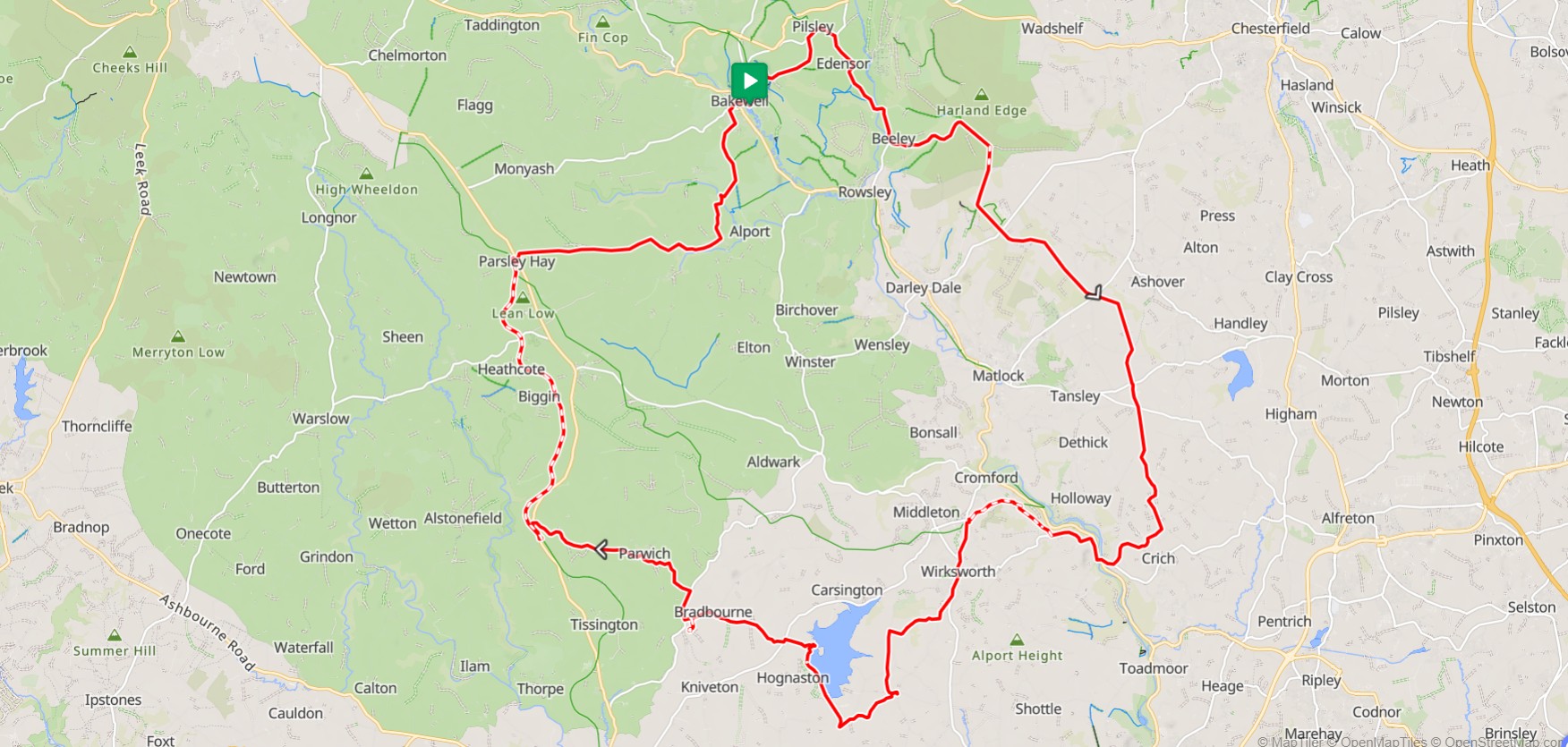 We climb steeply from Bakewell over to Edensor where you will see Chatsworth House set in its magnificent park. We ride parallel to the parkland before climbing steeply at Beeley to ride high above Matlock to Crich where there is a Tram museum. We descend now to the Derwent Valley near Cromford Mills where Sir Richard Arkwright built the worlds first water-powered cotton spinning mill, a cornerstone of the industrial revolution and now a UNESCO site. We continue through Wirksworth to Carsington Water that opened in 1992, one of the last major reservoirs built, where we can lunch in the visitor centre. We then head through Bradbourne to the Tissington Trail, leaving at Parsley Hay to return on quiet lanes through Youlgreave back to Bakewell.